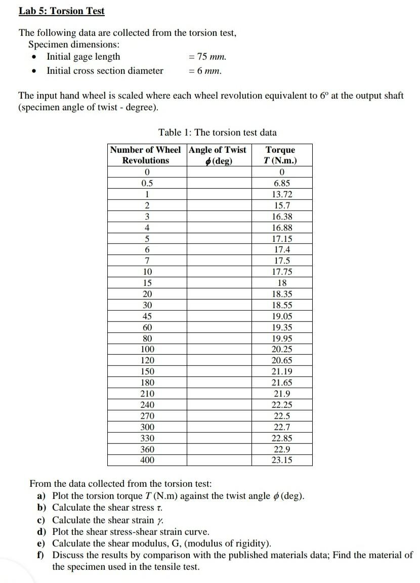 Solved Lab 5 Torsion Test The Following Data Are Collected Chegg Com